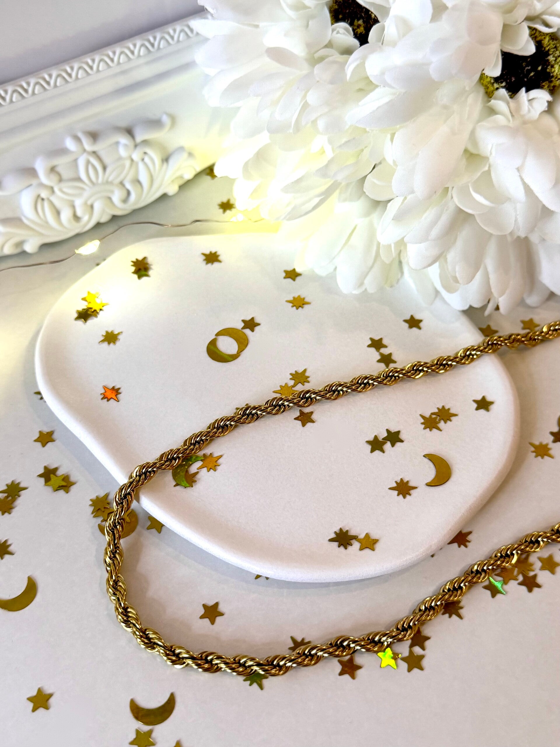 Setze ein starkes Statement mit dieser markanten, geschlechtsneutralen Halskette. Die gedrehte 4,5 mm starke Kette betont Robustheit und Stil zugleich – ideal für alle, die auffällige, zugleich elegante Accessoires mögen. Trage diese Kette als markantes Statement-Accessoire zu schlichten Outfits – sie harmoniert hervorragend mit urbanen Looks oder auch mit smart-casual Stilen. Ob als Einzelstück oder zusammen mit zarteren Ketten: sie verleiht deinem Look Charakter und Tiefe.