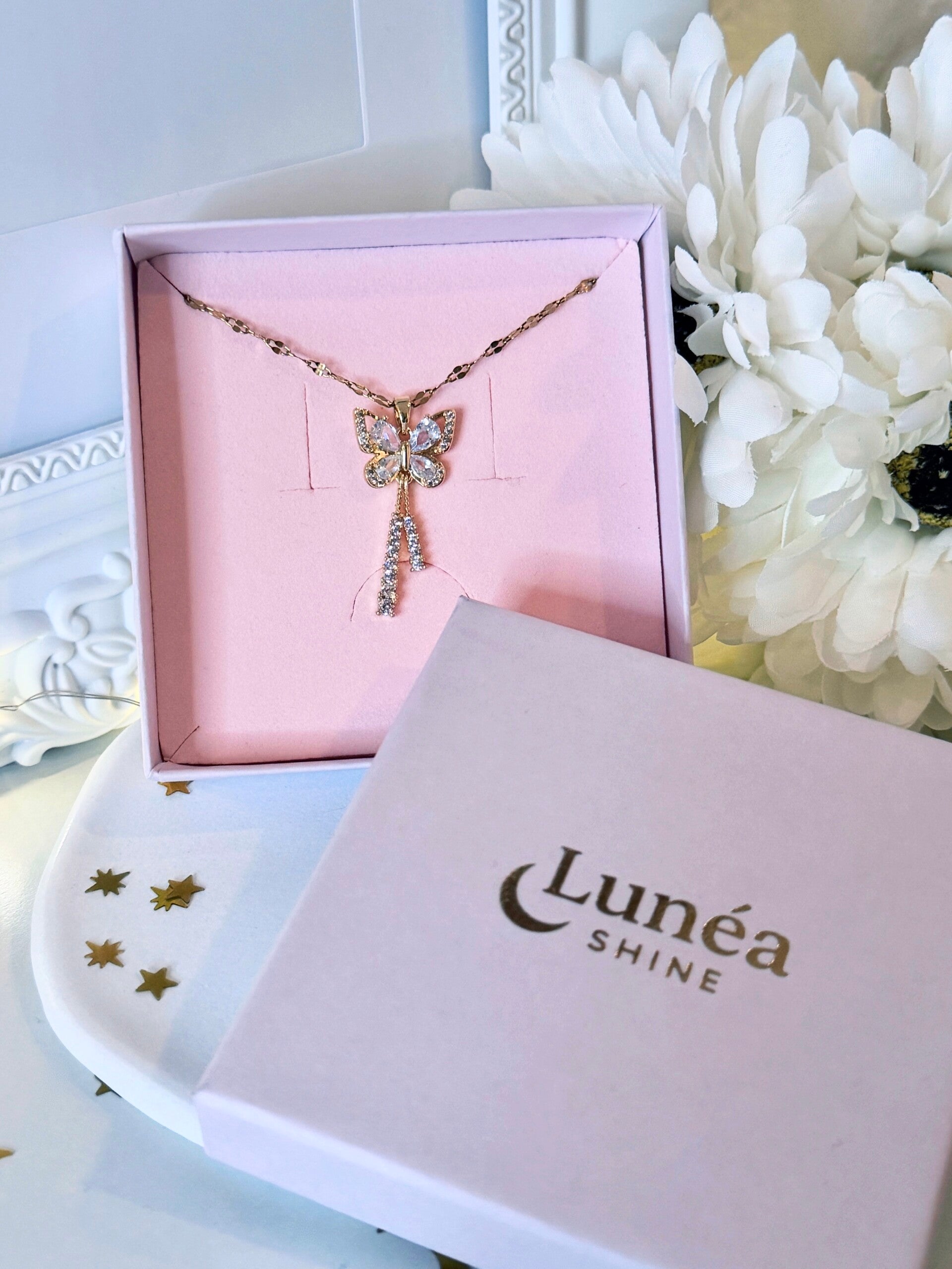 Diese Halskette steht für feminine Eleganz und die Schönheit der Veränderung. Das zarte Schmetterlingsmotiv verschmilzt zu einem harmonischen Design, das Leichtigkeit, Freiheit und natürliche Anmut widerspiegelt.