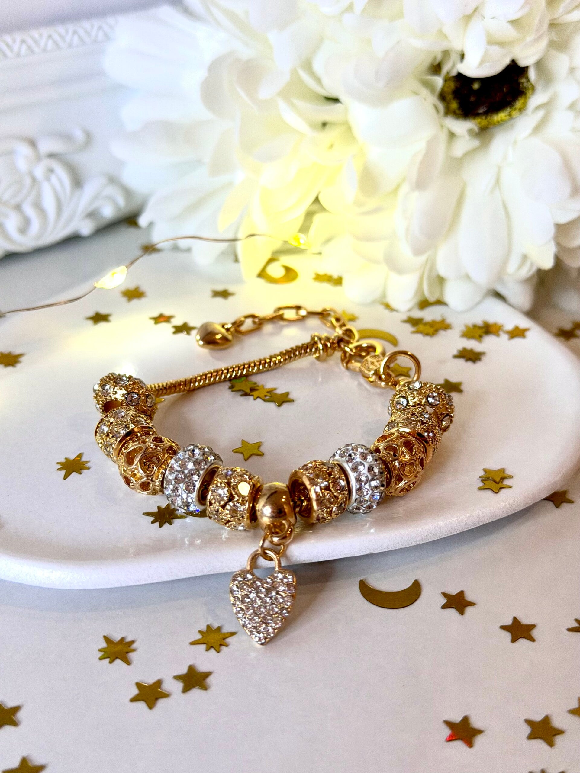 Das Perlen-Charmarmband mit Herzanhänger vereint goldene Perlen, glitzernde Details und ein zartes Herz-Element, das bei jeder Bewegung sanft mitschwingt. Wie kleine Erinnerungen reihen sich die einzelnen Elemente aneinander und erzählen von Nähe, Gefühl und besonderen Augenblicken.